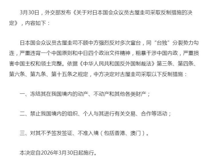 3月30日,外交部一纸令下,日本国会众议员古屋圭司被列入制裁清单。冻结在华全部资产、禁止任何交易合作、不准踏入中国内地及港澳一步。