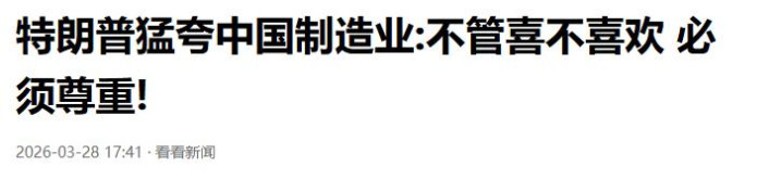 《特朗普猛夸中国制造业:不管喜不喜欢 必须尊重!》2026-03-28 17:41·看看新闻